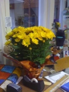 These flowers were from a special customer. He had been shot on the side of his face, so close to the eye that he couldn’t wear a mask. He had a divot in his face about the size of a thumb. We were challenged to fill that space with neoprene in his hood, and attach it to his mask in the right place for that space to seal. Sounds easy, but it was a challenging job. This was his thank you gift.